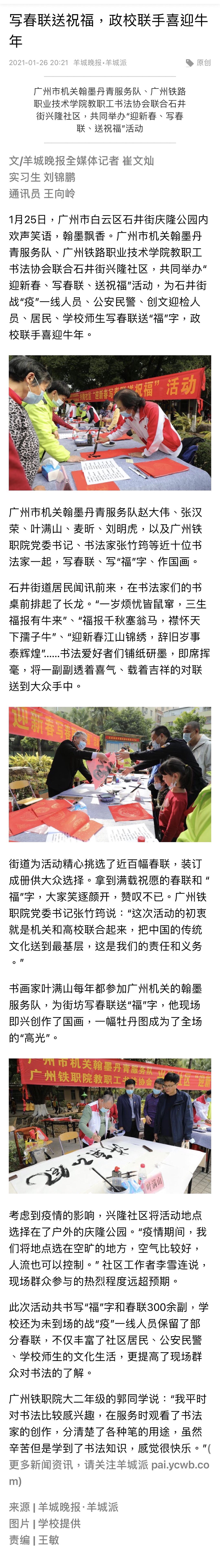 来源: 发布时间:2021-01-28 09:24:15 浏览次数: 次 【字体: 】 1月26日,羊城晚报客户端报道广州市机关翰墨丹青服务队、广州铁路职业技术学院教职工书法协会联合石井街兴隆社区,共同举办“迎新春、写春联、送祝福”活动。《写春联送祝福,政校联手喜迎牛年》报道原文如下: 分享到: